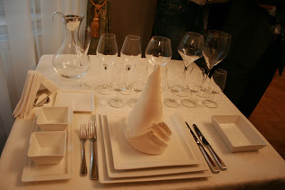 Pozitia de maestru de ceremonii i-a fost incredintata d-lui Dorin Popa care a prezentat succint cateva aspecte privind Centrul de cultura si civilizatie – istoria, necesitatea si scopul acestui centru, ajungand pana la a prezenta situatia vinului romanesc in raport cu consumatorul. Intrucat unul dintre scopurile centrului va fi acela de a educa consumatorul si a crea formatori de opinie, a fost prezentata “masa de studiu” a unui viitor cursant – mis-en-place-ul fiind de aceasta data doar cu rol decorativ. Cred ca e de prisos sa mentionez ca personalul insarcinat cu servirea si manipularea recuzitei a avut o tinuta impecabila si o discretie cum rar italnesti la restaurantele urbei de pe Crisul Repede.